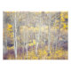 Une photographie capture une épaisse forêt de peupliers faux-trembles dans leur gloire automnale. Les arbres sont hauts avec de l'écorce blanche et des branches nues, leurs feuilles un jaune vif, créant un contraste saisissant contre le gris et marron muet du sol de la forêt. La lumière du soleil filtre à travers la canopée, jetant une lumière chaude sur la scène.