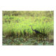 Photo d'un Grand Héron Bleu marchant à travers un étang. La surface de l'étang est recouverte de nénuphars. L'étang est entouré de tiges de plantes verts, qui borde un pré. Copyright photo ©2021 Kimberly J Tilley.