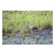 Photo d'un Grand Héron Bleu marchant à travers un étang. L'étang est couvert de nénuphars. L'étang est bordé de plantes de tiges vertes. Copyright ©2021 Kimberly J Tilley.