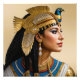 "Le réalisme de Cléopâtre VII : un portrait". Un rendu vivant de Cléopâtre VII la montre avec un nez proéminent, des yeux en amande et un menton fort. Ses cheveux, tressés et ornés d'or plumé, complètent son diadème royal en forme de vautour, symbolisant la pureté et la maternité, ainsi que le cycle éternel de la mort et de la renaissance. Des boucles d'oreilles perles et un collier complexe renforcent la présence de la reine avec un regard intelligent reflétant son charisme et son esprit légendaires.