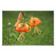 Un groupe de lys oranges avec taches brunes, probablement des Casquettes turcs ou des lys tigres. Les pétales du lis s'enroulent vers le haut et le bas vers la tige. Deux des lis ont entièrement fleuri, tandis qu'un tiers reste fermé.