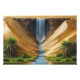 A captivating artwork depicting a cascading waterfall emerging between golden sand dunes, surrounded by lush palm trees and a vibrant green oasis. The painting reflects the contrast of nature between arid desert and flourishing greenery, creating a serene scene that transports the viewer to a world of tranquility and calm, where sand and water meet in stunning visual harmony.