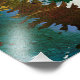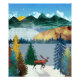 Un magnifique paysage avec des couleurs et des textures uniques montrant un paysage de montagne et de lac et une forêt multicolore avec un soleil levant et un orignal dans les tons de bleu, vert, or, et magenta.