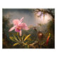 Orchidée rose et trois colibris imprimés. Huile sur panneau d'acajou à partir de 1871. Martin Johnson Heade était un peintre naturaliste et paysagiste américain qui dépeignait fréquemment des oiseaux et des fleurs. Orchidées et colibris étaient quelques-uns de ses sujets favoris, et ce tableau est l'un de ses plus beaux. L'orchidée de Cattleya et les trois oiseaux chanteurs représentent une orchidée de Cattleya entourée de deux colibris améthystes brésiliens et d'un colibri à queue rouge de la comète de Sappho au beau milieu d'une jungle au coucher du soleil. Un beau cadeau pour les amateurs de Martin Johnson Heade, de peintures d'orchidées, de peintures d'oiseaux colibris et de peintures naturalistes du XIXe siècle.