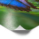 Un superbe papillon bleu Morpho au repos sur une branche verte et feuillue.