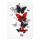 Un troupeau de papillons de morpho volants, réalistes, rouges et noirs sur un arrière - plan blanc avec des gouttes de peinture.
