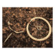 Roue à vélo et guidon décomposés avec cloche abandonnée dans les bois.