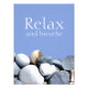 Un imprimé photo élégant et inspirant de pierres de galets multicolores et les mots "Relax and respthe" placé contre le sol bleu ciel. Un design original disponible exclusivement chez ©GardenEden online store.Tous droits réservés à la photo, au design et au libellé.