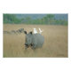 Photo d'un rhinocéros blanc avec deux aigrettes de bétail blanc sur le dos ; les aigrettes ont leurs ailes écartées, tandis que le rhinocéros trotte vers la caméra ; deux zèbres dans l'arrière - plan ; tous parmi une herbe jaune haute. Réserve forestière de Phinda, Afrique du Sud. Nous avons vu beaucoup de rhinocéros blancs en Afrique du Sud, des animaux isolés et des groupes de cinq ou six. Les rhinocéros blancs ont une vue assez médiocre, mais leurs sens de l'ouïe et de l'odorat sont très bons. Leur durée de vie est d'environ 40 ans, quand ils sont protégés du braconnage.