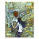 Un dessin artistique d'une fille et d'un garçon tenant la main en marchant dans les bois.