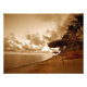 Une scène de plage aux tons sépia avec un beau parapluie de chaume et un ciel spectaculaire au-dessus