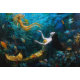 "Seraphina" - Belle Sirène Mystique. Paysage aquatique : Dans ce cadre sous-marin surréaliste et serein, une belle sirène avec une queue de poisson dorée très décorée se trouve sur le fond de la mer, ses cheveux flottants dérivent dans le courant d'une mer bleue étonnante. Les créatures marines environnantes, dont une pieuvre inquisante et un poisson vivant, donnent vie à la scène. Les tons multicolores subtils et les détails complexes du style Pré-Raphaélite en font un tableau captivant et reposant.