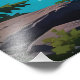 - The **background landscape** is dramatic: snow-capped mountains, dense pine forests, and a winding river under a vibrant sky, blending serenity with grandeur.