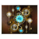 Turquoise lenses with antique watch with brass gears and golden keys on rusty, brown background. Steampunk style.