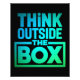 A motivational quote reads "Think Outside The Box" in bold, gradient blue and green letters against a transparent background. The word "BOX" is encapsulated in a rectangular outline.