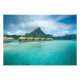 Photographie d'un luxueux complexe de bungalows au toit de chaume surplombant l'eau dans une station balnéaire au bord d'un lagon bleu clair avec vue sur l'île tropicale de Bora Bora, près de Tahiti, en Polynésie française.
