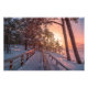 Winter landscape with covered in snow pine and fir trees during sunset. View of coniferous forest with wooden pathway near sea coast.