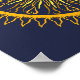 Beau design de mandala circulaire soleil en orange, or, jaune sur arrière - plan bleu foncé.
