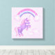 Un imprimé en toile d'imaginaire avec licorne violette, arc-en-ciel pastel et nuages roses avec bordure violette et poussière d'étoile. Joli ajout à n'importe quelle chambre de princesse.