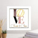 Impression de papier romantique, avec le mot LOVE fait en or, rose, noir et taupe, posé sur un arrière - plan blanc, avec un cadre doré fin autour du bord extérieur. Personnalisez le texte en or, en bas, pour lire ce que vous voulez.