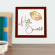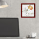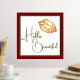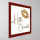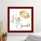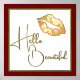 Impression de papier de mode avec des lèvres dorées sur un arrière - plan blanc, avec un cadre mince en feuille or et un cadre rouge mat autour de l'extérieur. Texte en feuille d'or : Hello Beautiful.