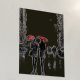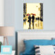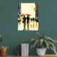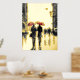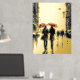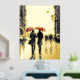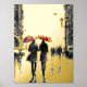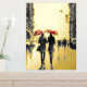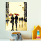Impression de papier peint élégant avec des illustrations d'une journée pluvieuse en ville, avec un couple tenant des parapluies rouges. Grande impression de feuille pour les zones de vie.