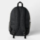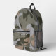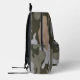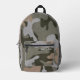 Sac à dos avec motif de camouflage. Les couleurs sont le vert de l'armée, le vert foncé de la forêt, le gris clair et le bronzage. Inclure un nom, en gris, une police désespérée, dans la poche zippée ou supprimer l'exemple de texte.