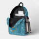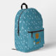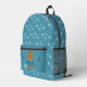 Un beau sac à dos bleu enfant, pour retourner à l'école, avec un ours brun portant une canne de pêche d'une main et un seau rempli de poissons de l'autre. Le reste du dos a un motif d'os de poisson. Personnalisé avec les initiales de l'enfant. © ArianeC Illustrations-Tous droits réservés