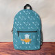 Un sac à dos bleu enfant amusant avec un ours polaire tenant une canne de pêche dans une main et un seau rempli de poissons dans l'autre. Le reste du sac a un motif d'os de poisson. Personnalisez-le avec les initiales de l'enfant. © ArianeC Illustrations-Tous droits réservés