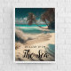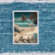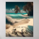 Turquoise water and palm trees on a white sandy art block. Quote: "In love with the sea."