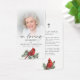 This elegant memorial prayer card features a cherished photo paired with the heartfelt words In Loving Memory and a symbolic red cardinal resting on evergreen branches. Often seen as a sign of comfort and continued presence, the cardinal adds gentle meaning to this timeless design. The reverse side includes a comforting prayer accented with a simple cross offering peace and reflection, making this card a thoughtful keepsake for a funeral, memorial service or Celebration of Life shared with family and friends. Its small and portable size of 3.5x2" (wallet-sized) makes it convenient for loved ones to carry it with them as a reminder of your loved one’s life and spirit. Personalization makes each card unique.