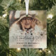 Personalized memorial christmas ornament featuring a treasured photo of your loved one, a simple white frosted heart overlay, the saying "in loving memory", their name, and dates.
