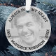 Personalized keepsake memorial christmas ornament featuring a photo either side of your lost loved one, a white ovelay, the sympathy saying "always in my heart", their name, and dates.