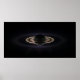 With giant Saturn hanging in the blackness and sheltering Cassini from the sun's blinding glare, the spacecraft viewed the rings as never before, revealing previously unknown faint rings and even glimpsing its home world. This marvellous panoramic view was created by combining a total of 165 images taken by the Cassini wide-angle camera over nearly three hours on Sept. 15, 2006. The full mosaic consists of three rows of nine wide-angle camera footprints; only a portion of the full mosaic is shown here. Colour in the view was created by digitally compositing ultraviolet, infrared and clear filter images and was then adjusted to resemble natural colour. The mosaic images were acquired as the spacecraft drifted in the darkness of Saturn's shadow for about 12 hours, allowing a multitude of unique observations of the microscopic particles that compose Saturn's faint rings. Ring structures containing these tiny particles brighten substantially at high phase angles: i.e., viewing angles where the sun is almost directly behind the objects being imaged. During this period of observation Cassini detected two new faint rings: one coincident with the shared orbit of the moons Janus and Epimetheus, and another coincident with Pallene's orbit. (See PIA08322 and PIA08328 for more on the two new rings.) The narrowly confined G ring is easily seen here, outside the bright main rings. Encircling the entire system is the much more extended E ring. The icy plumes of Enceladus, whose eruptions supply the E ring particles, betray the moon's position in the E ring's left-side edge. Interior to the G ring and above the brighter main rings is the pale dot of Earth. Cassini views its point of origin from over a billion kilometres (and close to a billion miles) away in the icy depths of the outer solar system. See PIA08324 for a similar view of Earth taken during this observation. Small grains are pushed about by sunlight and electromagnetic forces. Hence, their distribution tells much about the local space environment. A second version of the mosaic view is presented here in which the colour contrast is greatly exaggerated. In such views, imaging scientists have noticed colour variations across the diffuse rings that imply active processes sort the particles in the ring according to their sizes. Looking at the E ring in this colour-exaggerated view, the distribution of colour across and along the ring appears to be different between the right side and the left. Scientists are not sure yet how to explain these differences, though the difference in phase angle between right and left may be part of the explanation. The phase angle is about 179 degrees on Saturn. The main rings are overexposed in a few places. This view looks toward the unlit side of the rings from about 15 degrees above the ringplane. Cassini was approximately 2.2 million kilometres (1.3 million miles) from Saturn when the images in this mosaic were taken. Image scale on Saturn is about 260 kilometres (162 miles) per pixel. The Cassini-Huygens mission is a cooperative project of NASA, the European Space Agency and the Italian Space Agency. The Jet Propulsion Laboratory, a division of the California Institute of Technology in Pasadena, manages the mission for NASA's Science Mission Directorate, Washington, D.C. The Cassini orbiter and its two onboard cameras were designed, developed and assembled at JPL. The imaging operations centre is based at the Space Science Institute in Boulder, Colo.