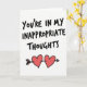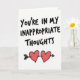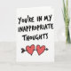 This card features a bold statement in big, black letters that say 'YOU’RE IN MY INAPPROPRIATE THOUGHTS'. The text looks like it was written in a playful, almost childish way. Below the words are two hearts in vibrant coral-red, pierced by a hand-drawn arrow. They match the bold style of the text, creating a cohesive look. Even though hearts and arrows usually represent love, they take on a mischievous feel paired with the cheeky message above. The white background makes everything stand out clearly, giving the card a fun and bold vibe. This design is a modern take on expressing love, mixing honesty with a hint of playfulness ❤️💌🍫. It's perfect for sharing your Valentine's Day feelings with a touch of humor.