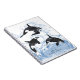 Incredible watercolor orcas art of swimming and jumping orcas and a baby orca with water splashes and waves.