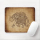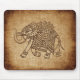 Digital image of a traditional fabric stamp from India of an elephant in all is fine gear carrying 4 passengers on a burlap background.