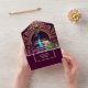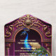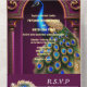 A beautiful and regal all-in-one invitation featuring a regal and vibrant peacock with its iridescent blue chest shining and its luxurious tail feathers cascading doown behind him. He is framed by a royal palace arch that has decorative flourish swirls on it all set against a plum coloured background. The back top flap delights with ornate vintage paisley teasing of what is to come. White text templates for your custom wording appear on both sides. The bottom third has a tear off response card with personalized rsvp address for your guests to complete plus an exquisite pearl and gold adorned peacock feather. These are ideal for Hindi, Hindu, Sanatani Dharma and ethnic asian weddings weddings, engagements, anniversaries; bridal showers and birthday parties. Simply change the wording to suit your special event or occasion.