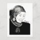 A black and white illustration in black ink of an elderly indian woman.