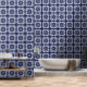 Easy to install peel and stick wallpaper with indigo blue and white Mediterranean tile pattern inspired by Portuguese Azulejo, featuring an original illustration of elegant nature motifs. With its modern yet classic design with intricate details, this wallpaper is perfect for bathroom, kitchen, living or dining room wall. Bring timeless sophistication to your home interior design with this stunning tile patterned wallpaper, effortlessly blending tradition with a contemporary flair, creating a stylish and inviting living space.