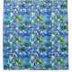 A fun shower curtain decorated with a pattern of bubbles in several shades of blue, purple and green hand painted with watercolor on a white background. Fun bubbles bathroom decor!