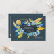 A dramatic floral invitation featuring watercolor wild flowers in golds and blues against a deep blue background.