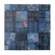 A seamless indigo patchwork pattern ceramic tile featuring floral details and textured plaid squares. The mix of denim blues, delicate blossoms, and stitched textures creates a cozy boho aesthetic.