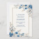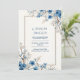 Welcome your guests to a celebration of timeless elegance with this exquisite hand-painted botanical scene. The composition features striking clusters of indigo blue petal blooms with shimmering gold vein details, perfectly complemented by delicate sprays of white cherry blossom. Organic branches reach across a warm creamy paper texture, all precisely enclosed within a sophisticated double line border of navy and bronze. This wedding invitation is an ideal choice for a sophisticated spring ceremony, a chic garden celebration, or a winter-themed event with a touch of royal blue. It ensures your event details are framed with a sense of high-end grace and natural beauty.