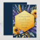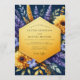 This elegant design captures the beauty of a late summer meadow at twilight. Vibrant golden sunflowers and delicate lavender sprigs bloom against a deep indigo background. Touches of golden wheat and subtle greenery complete this rich and artistic botanical arrangement, perfect for a rustic and romantic union.