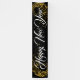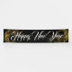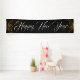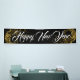 This Holiday banner is shown in the indoor style, Shown in Black with White "Happy New Year" text in a fancy script with two Gold looking swirls of stars on each end.