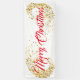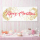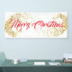 This Holiday banner is shown in the indoor style, Shown in White with Red "Merry Christmas" fancy script with two Gold looking swirls of stars on each end.