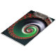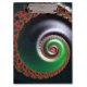 This work features a complex, swirling fractal pattern with a spiral structure that appears to extend infinitely inward. The primary colors are vivid red and lush green, contrasting against a deep, dark background. Along the spiral's path, intricate, smaller fractal shapes repeat, creating a sense of depth and movement. The red fractal elements resemble organic shapes, almost like blooming flowers or curled leaves. The green tones gradually transition to silvery whites closer to the center, adding a glowing effect. Overall, the image evokes a feeling of infinite complexity and dynamic energy.
