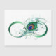 The symbol of infinity with a bright, green, artistic peacock feather on a white background. Tattoo style.