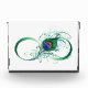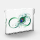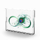 The symbol of infinity with a bright, green, artistic peacock feather on a white background. Tattoo style.